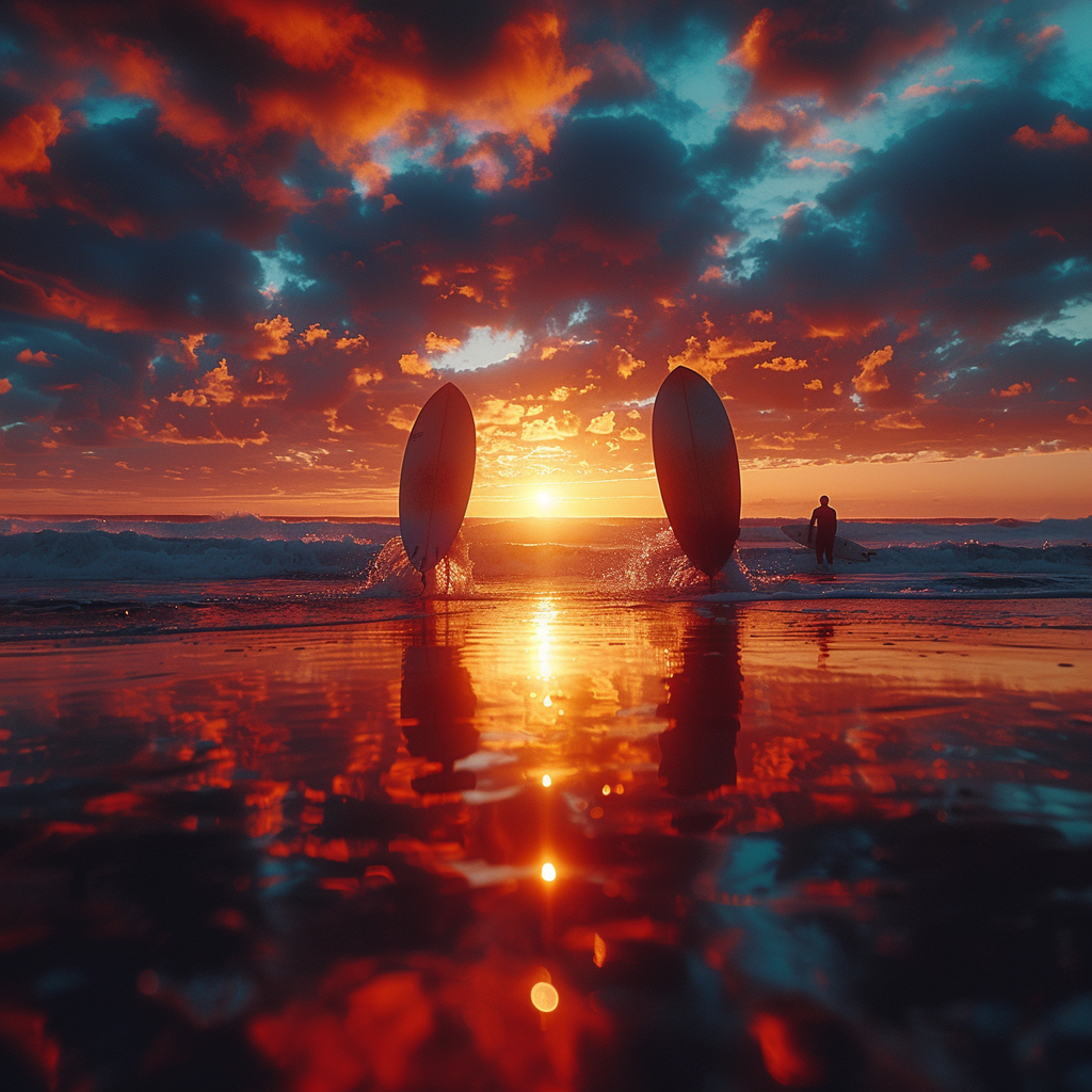 Sunset in Tottori, Japan. 🌅 The sky ablaze with colors as surfers catch the last waves of the day. This breathtaking scene captures the essence of the perfect beach evening.
